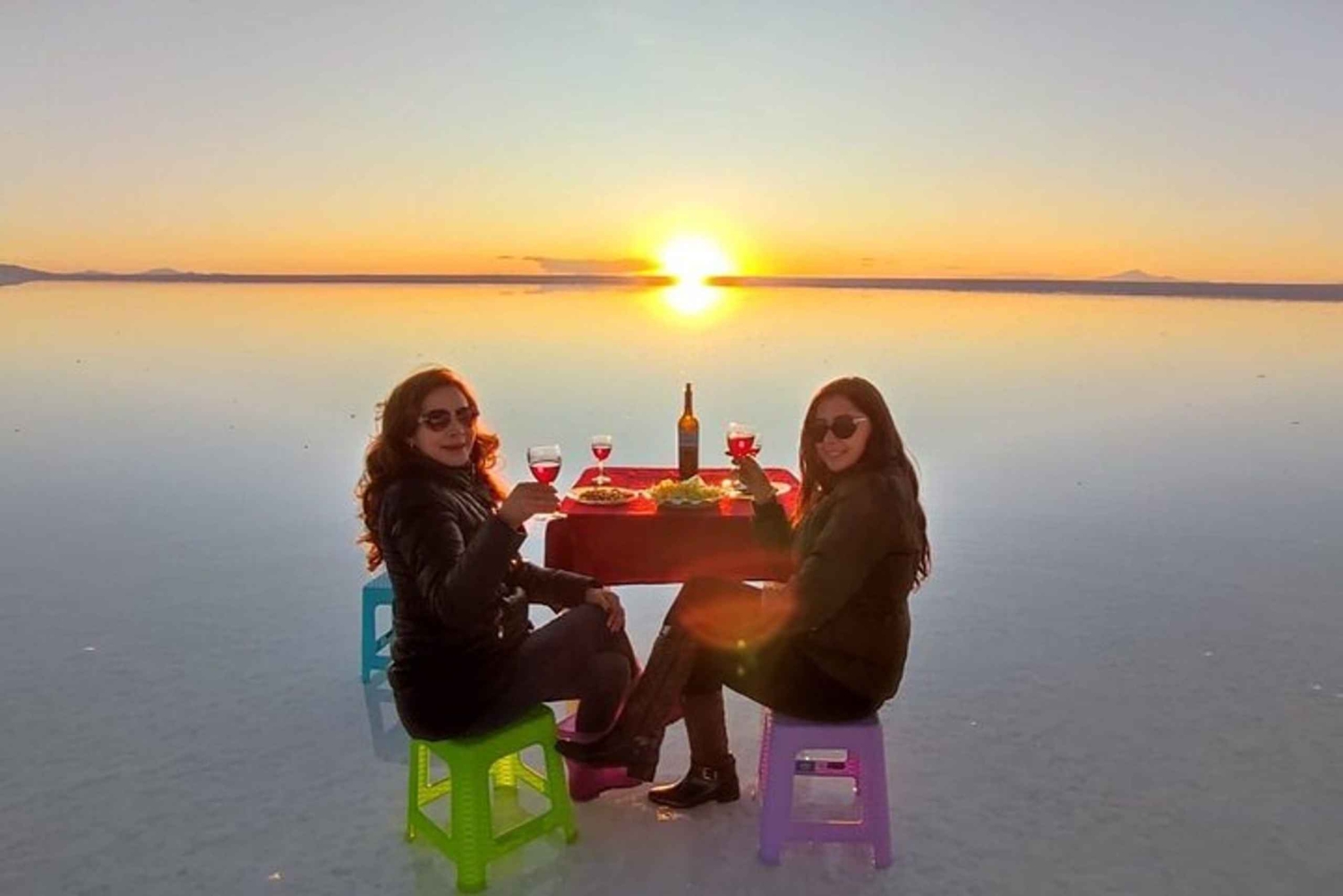 Tag dig derefter god tid til at organisere din gruppe og tage sjove billeder, der er forvrænget af perspektiv og proportioner, på den blændende hvide overflade af saltsletten. Til sidst går du til et stort område for at få den unikke oplevelse at se en smuk solnedgang over saltsletten, der spreder sine blændende farver over hele Salar de Uyuni, og nyde den med et glas vin.