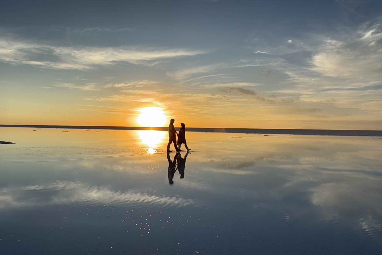 Derefter vender du tilbage til den hvide saltslette for at observere dette naturlige vidunder, som kun kan ses på denne del af planeten. Din guide fører dig til en del af saltsletten, som er oversvømmet med vand, hvor du kan se de berømte, fantastiske refleksioner, som er stærkest ved solopgang.