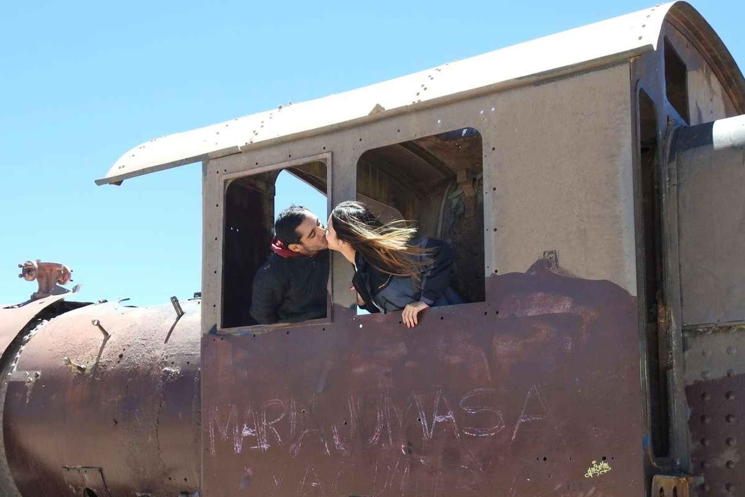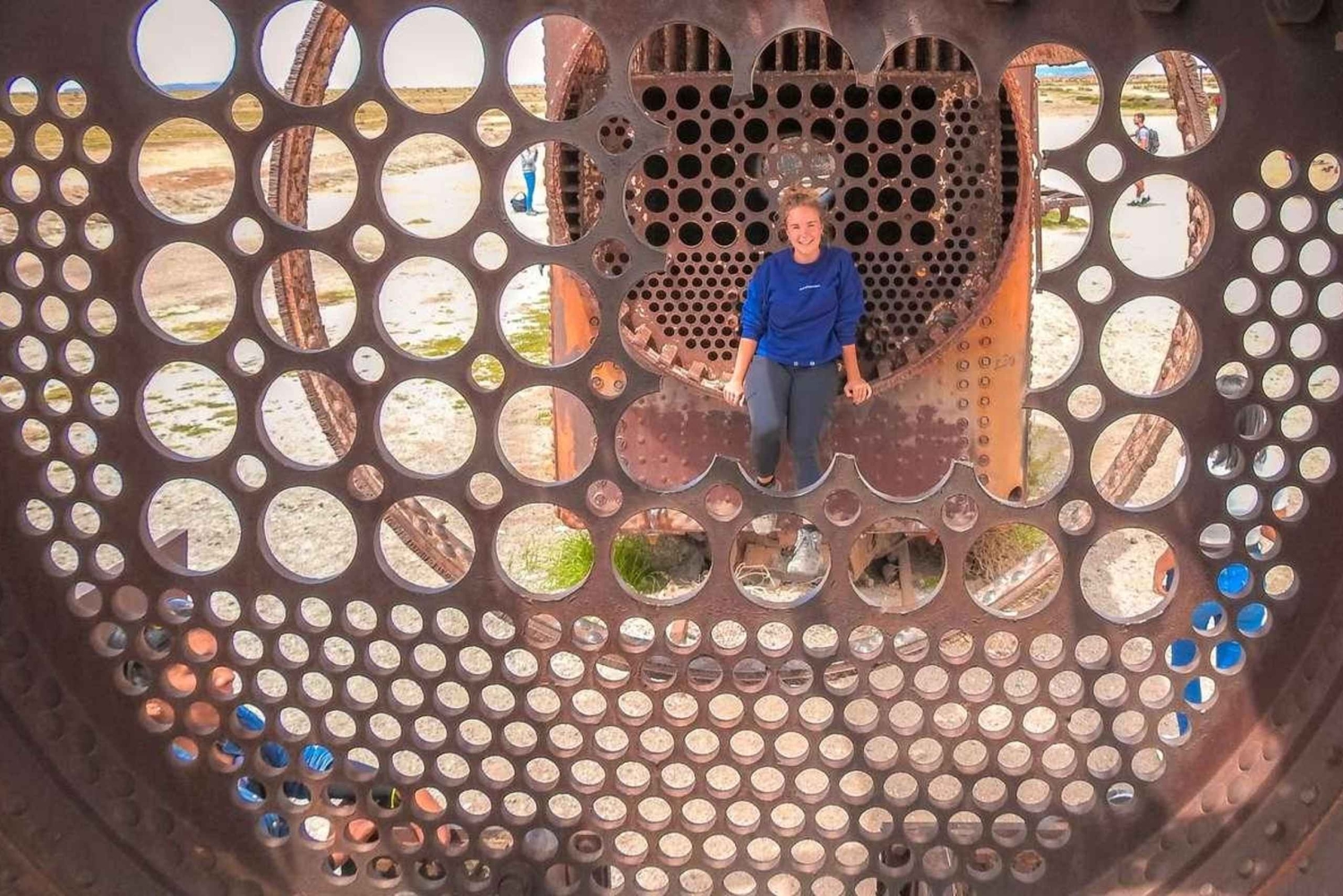 Zur angegebenen Zeit holen wir dich an deinem Hotel in Uyuni ab und fahren in Richtung der Uyuni-Salzebene, eine der berühmtesten Landschaften Boliviens. Unterwegs machen wir einen kurzen Halt am 'Eisenbahnfriedhof', einer großen Esplanade voller rostiger Lokomotiven, auf der die Zeit stehen geblieben zu sein scheint... Du wirst es lieben!