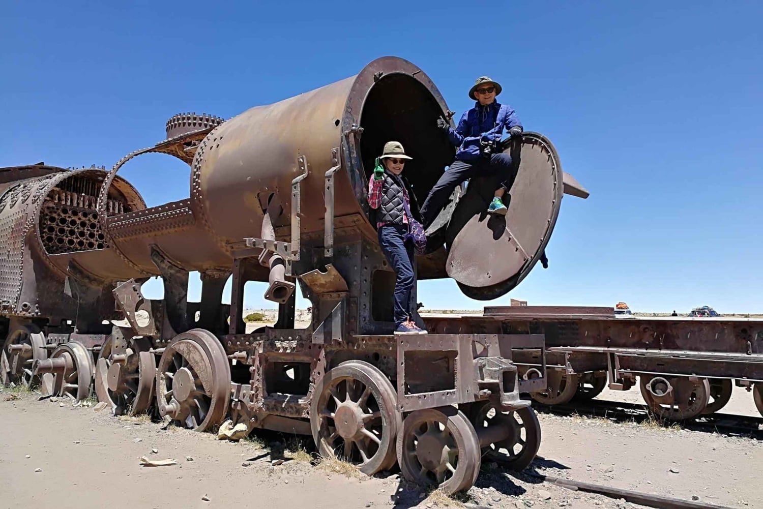 Der erste Halt ist der unheimliche 'Zugfriedhof' am Rande von Uyuni.