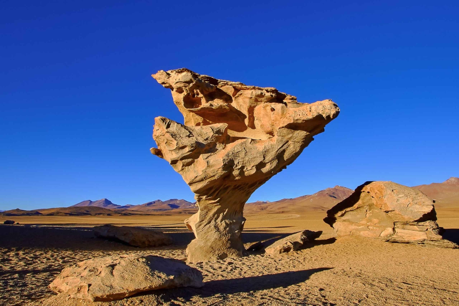 Disfruta de un almuerzo al aire libre rodeado de la inmensidad del salar y luego aventúrate en el fascinante Desierto de Siloli, famoso por sus formaciones rocosas esculpidas por los implacables vientos de la región, incluido el emblemático Árbol de Piedra, monumento nacional. Por último, descansa en un acogedor hotel familiar o similar, como el Huallajara, donde podrás recargar las pilas para las aventuras que te esperan al día siguiente.