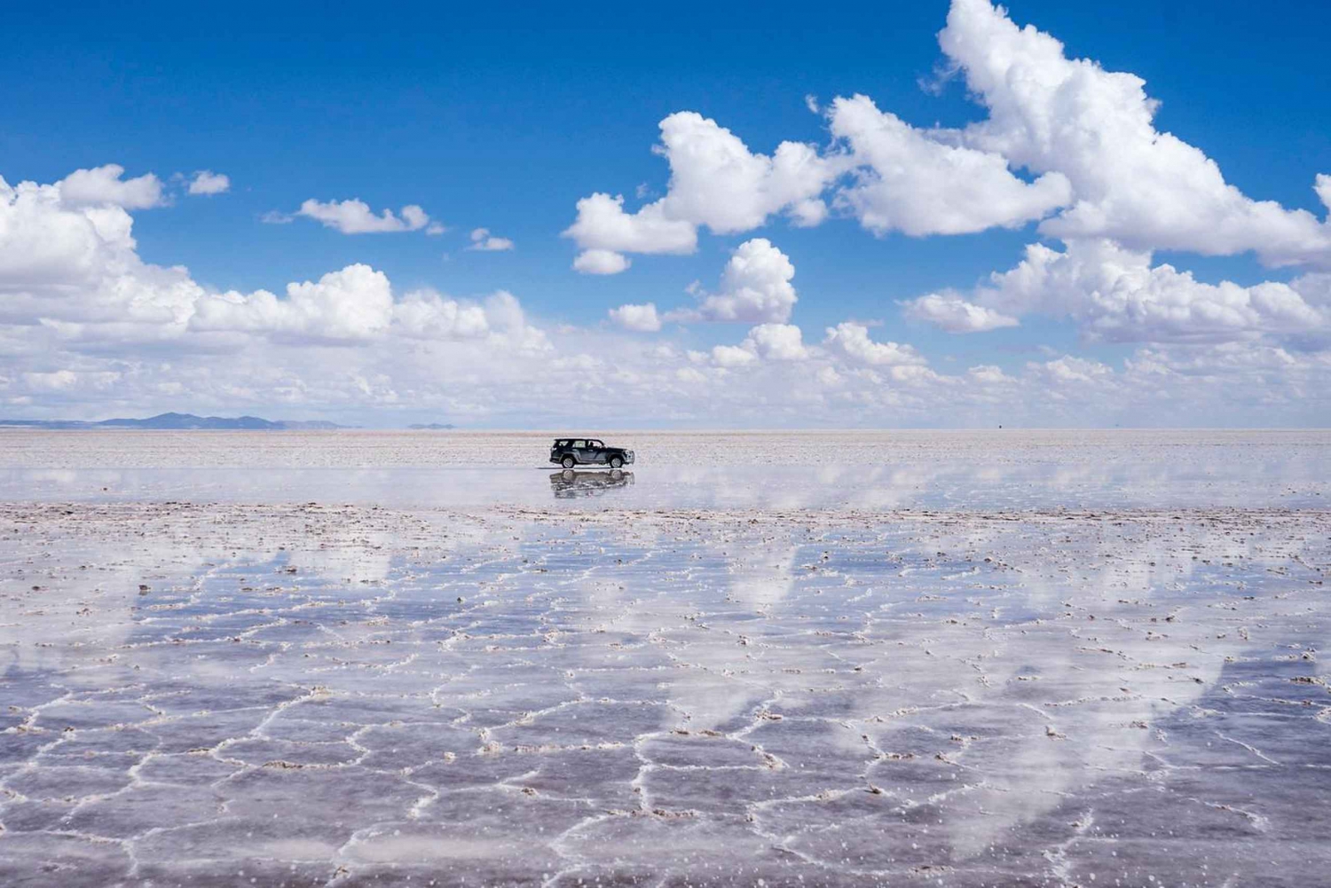 Travel from La Paz to Uyuni on an overnight bus. Then, embark on a full-day tour of the Salar de Uyuni. Enjoy a picnic lunch, a glass of wine at sunset, and a night bus back to La Paz.