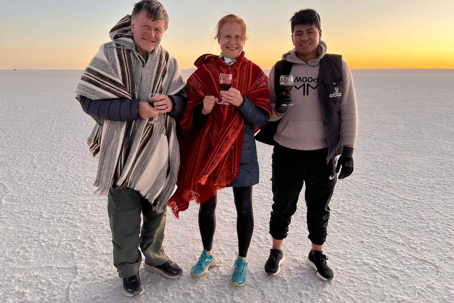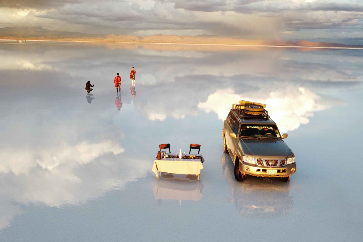 Noudetaan bussiterminaalista ja siirrytään hotelliin lepäämään. Nauti aamiainen ennen kiertomatkan aloittamista. Kierros sisältää kohokohtia, kuten junahautausmaa, Colchani, käsityöläisliikkeitä, Isla Incahuasi ja Salar de Uyuni. Nauti yksityinen lounas keskellä suolatasankoa ja nauti auringonlaskun malja.