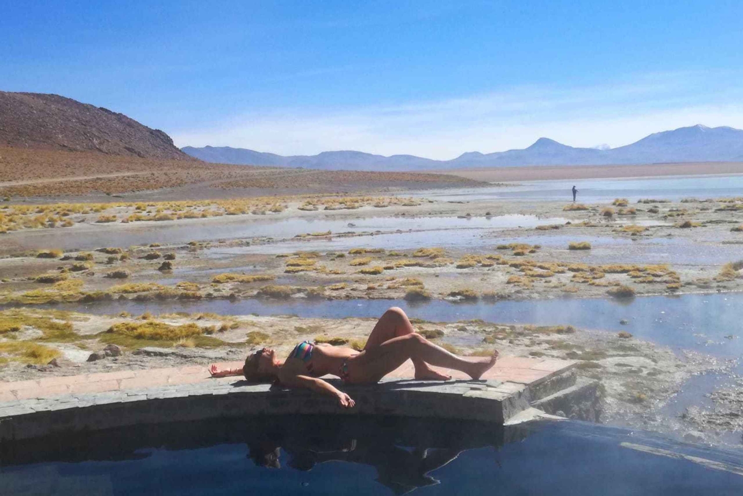 Jatkat matkaasi matkalla tien korkeimman kohdan yli noin 5 000 metrin korkeudessa merenpinnasta. Sen jälkeen matkasi jatkuu vierailulla Laguna Coloradassa, ennen kuin jatkat matkaa 'kivipuun' luo ja ylätasangon tietä pitkin Polquesin kuumille lähteille. Siellä voit ottaa kuuman kylvyn ja ylittää sitten Dalin autiomaan päästyäsi Licancabur-tulivuoren juurella sijaitsevaan vihreään laguuniin.