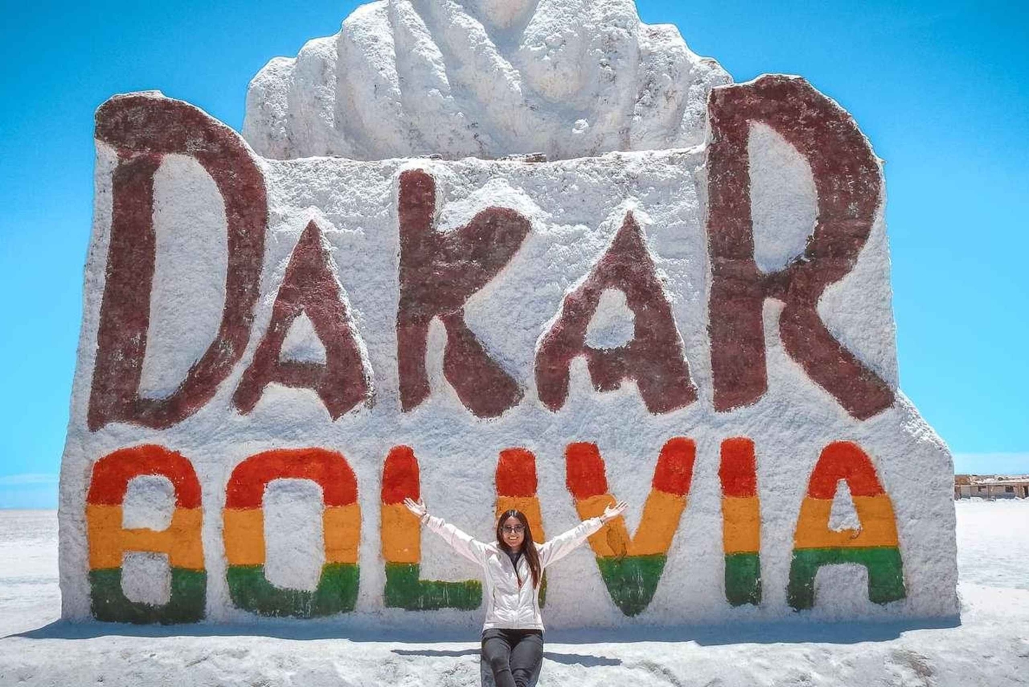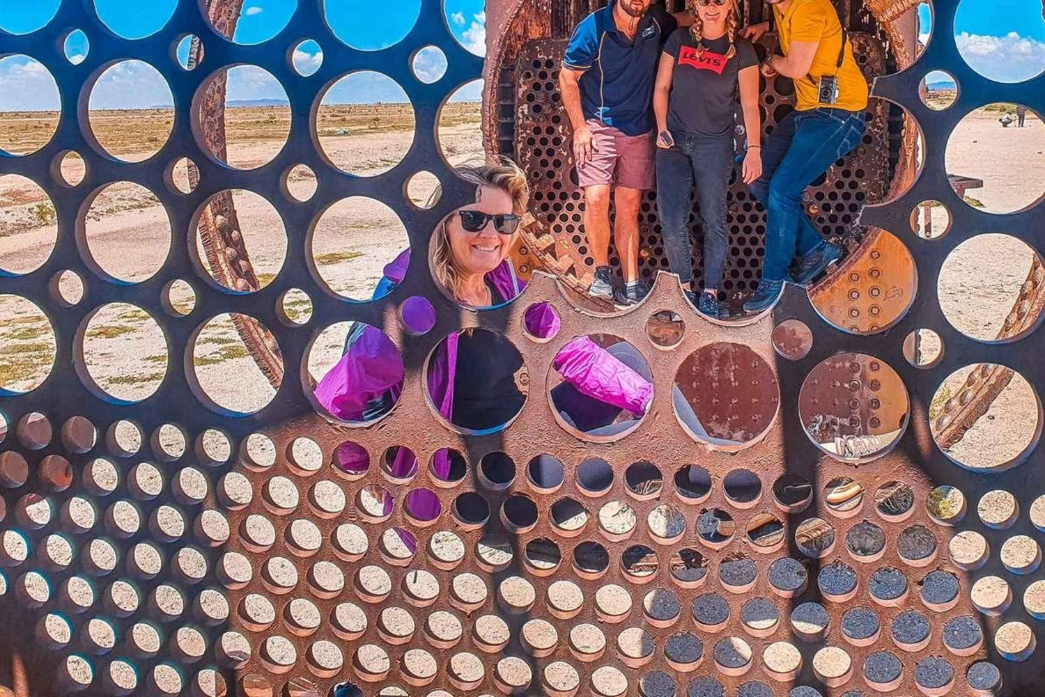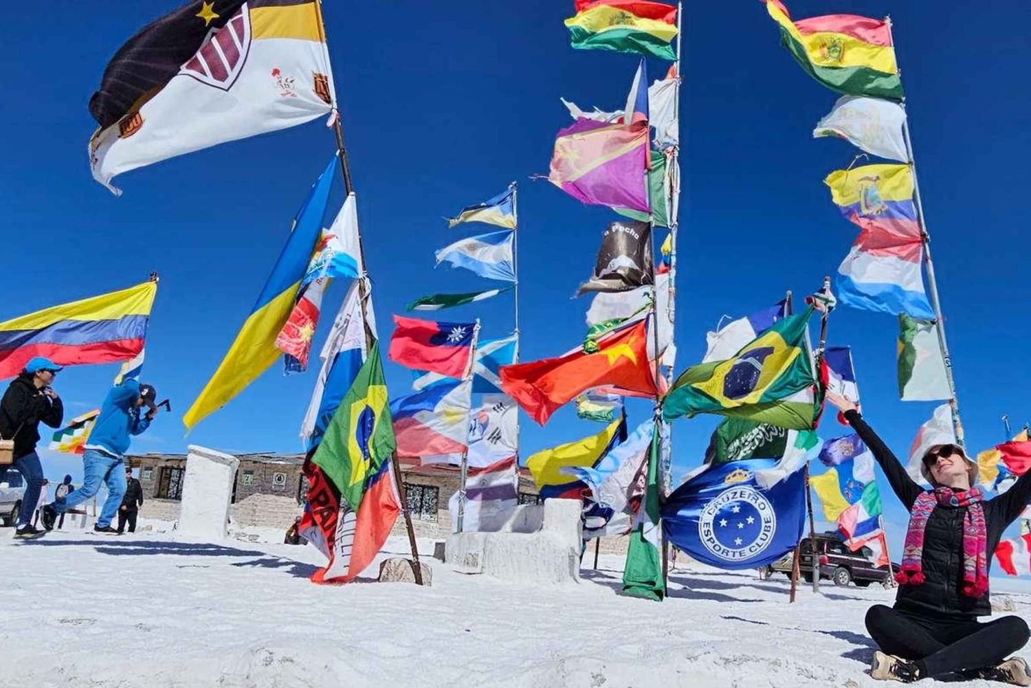 Tutustu Salar de Uyuniin koko päivän retkellä Uyunista. Vieraile aavemaisella junahautausmaalla, tutustu maailmanlippuihin ja ota valokuvia Dakar-kisan muistomerkillä. Nauti herkullinen lounas ja katsele auringonlaskua viinilasillisen kera.