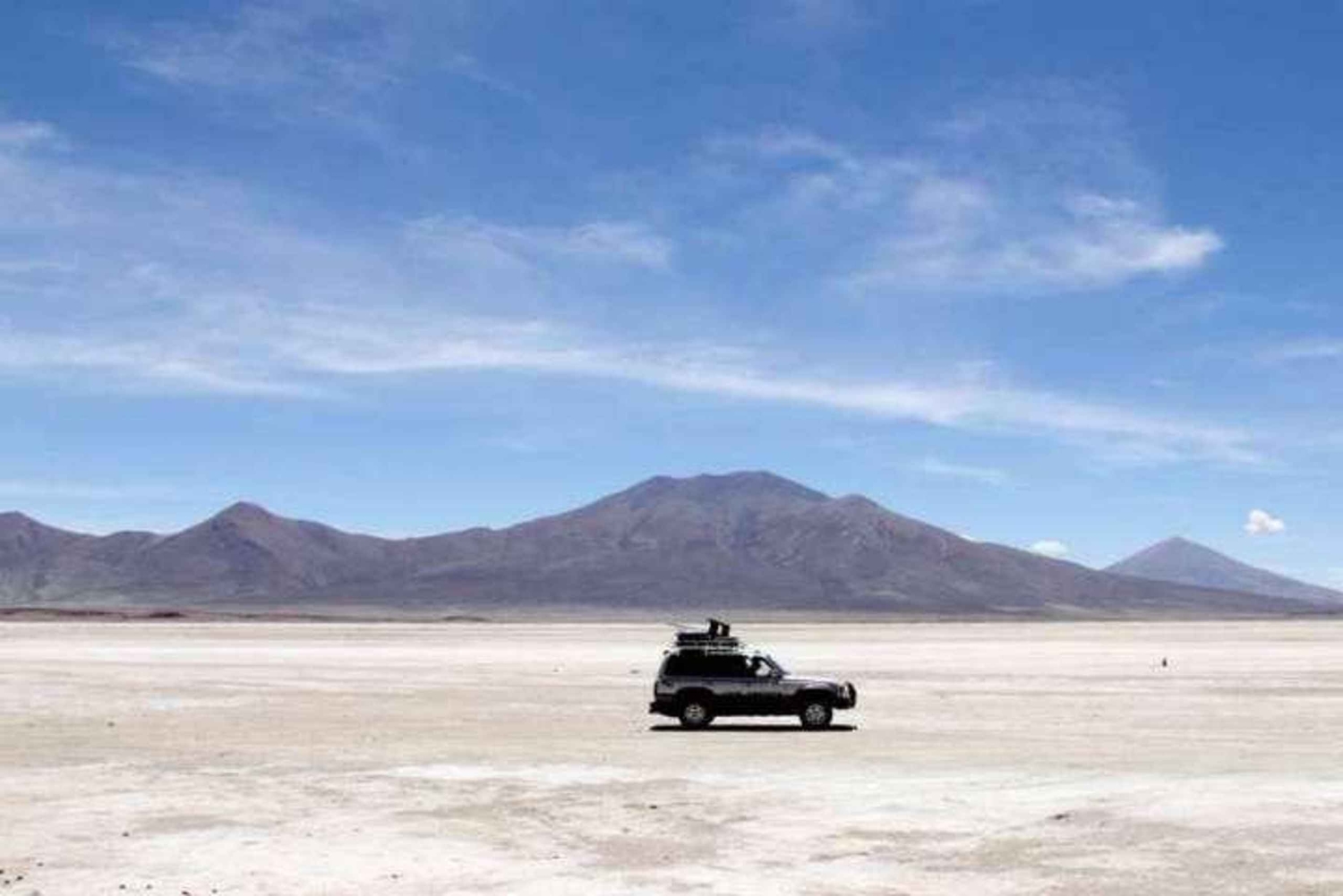 Lähtö koordinoidulta pisteeltä klo 06:30 yhteisellä minibussilla, jonka matka rajalle kestää 1 tunnin. Jatkamme lähtöä Chilen tullissa ja suuntaamme Hito Cajóniin, jossa Bolivian raja sijaitsee. Nautimme rajalla runsaan aamiaisen. Saavuttuamme Bolivian alueelle vaihdamme 4×4-jeepin kyytiin ja aloitamme reitin. Muutamassa minuutissa saavumme ensimmäiselle pysähdyspaikalle, Laguna Blancalle ja Laguna Verdelle, joka sijaitsee majesteettisen Licancabur-tulivuoren juurella. Jatkamme pohjoiseen, kunnes saavumme Salvador Dalín autiomaahan. Reitti jatkuu Polques-joelle, jossa meillä on mahdollisuus nauttia lohduttavasta kylvystä sen kuumissa lähteissä. Saavumme koko reitin korkeimmalle kohdalle, 4 960 metrin korkeudessa sijaitsevalle Geiseres del Sol de Mañanalle.