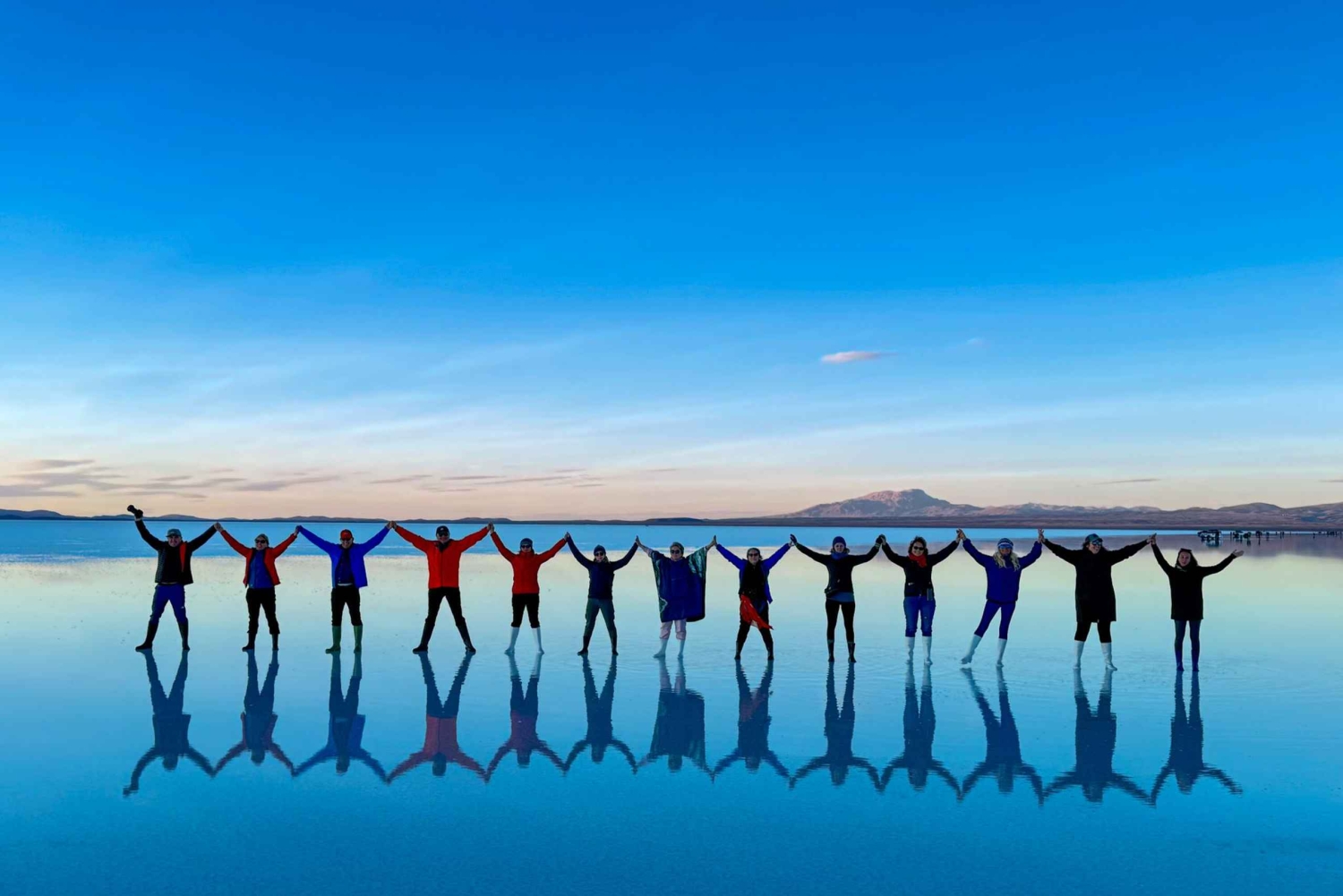 Geniet van de zonsondergang aan de oevers van de zoutvlakte van Uyuni, vergezeld van een speciale toast. Aan het einde van de tour word je teruggebracht naar je hotel.