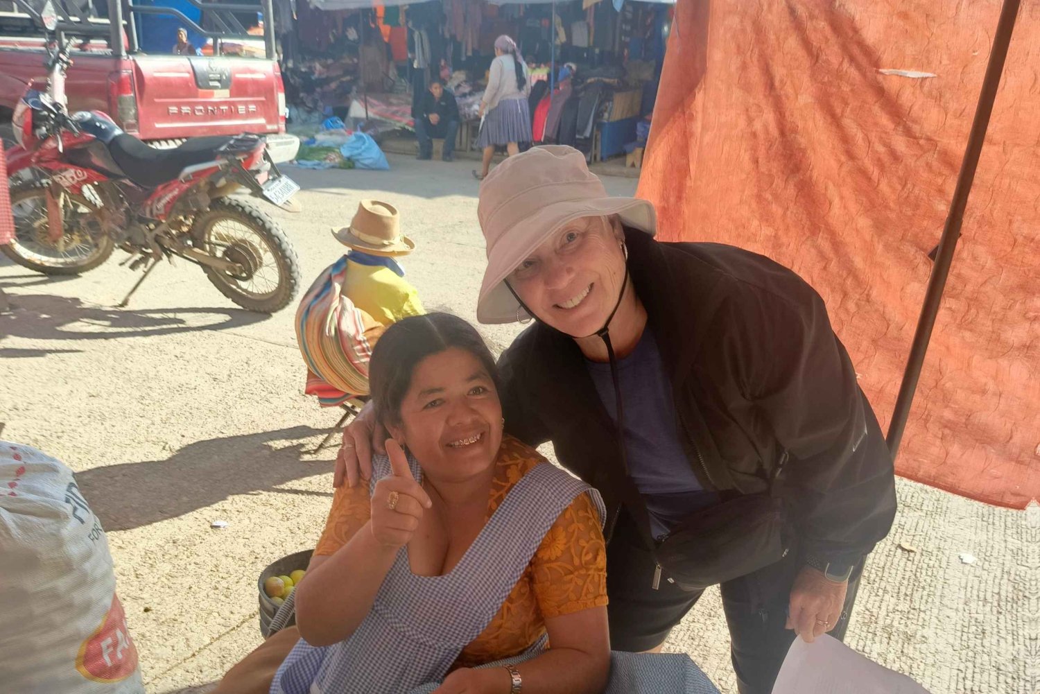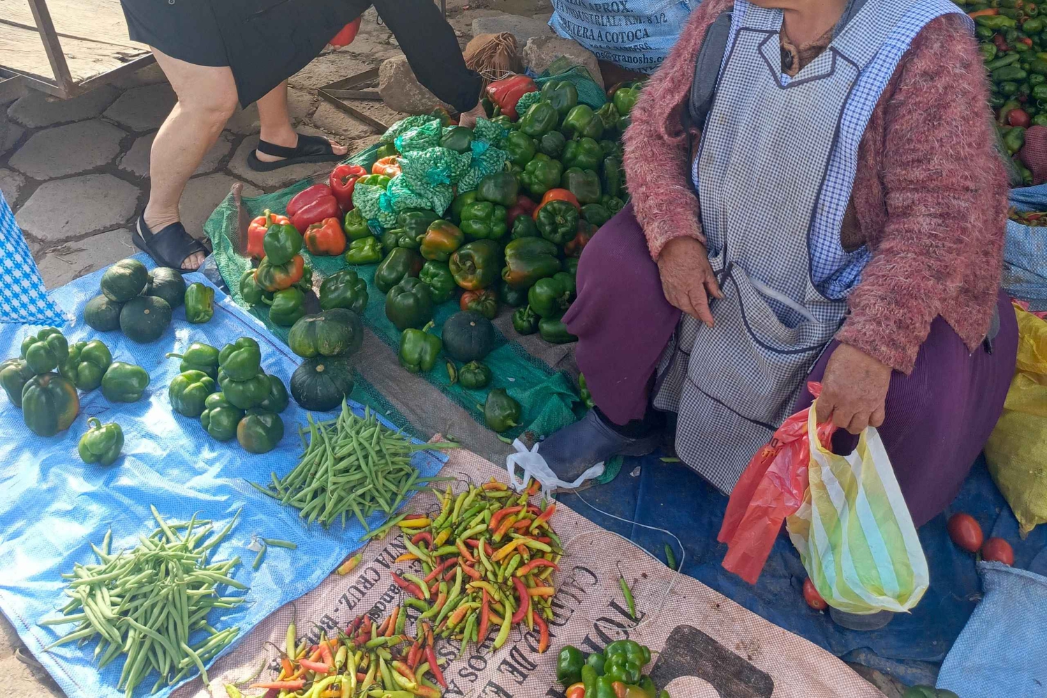 For å starte det gastronomiske eventyret henter vi deg på hotellet ditt med privat transport til det tidspunktet du velger for turen. Vi kjører direkte til EL MORRO, et marked som forsyner alle markedene i byen Sucre. Der handler vi inn ingredienser som frukt, grønnsaker, kylling osv. Ikke bekymre deg, vi gir deg penger til innkjøpene. Du vil ha 30 til 40 minutter til å handle og snakke med damene (Caseras) på markedet. Du handler selv, med en meny på engelsk og spansk, og guiden vil følge deg uten å blande seg inn, med mindre det er nødvendig. Etter handlingen og besøket på markedet El Morro kjører vi til huset (CHICHALICHE) i 10 minutter for å begynne å lage mat.