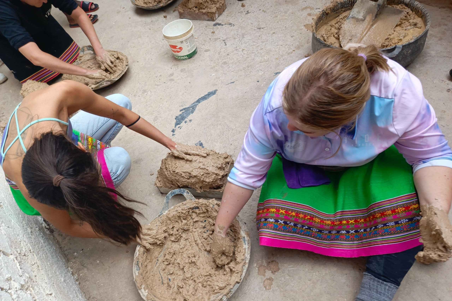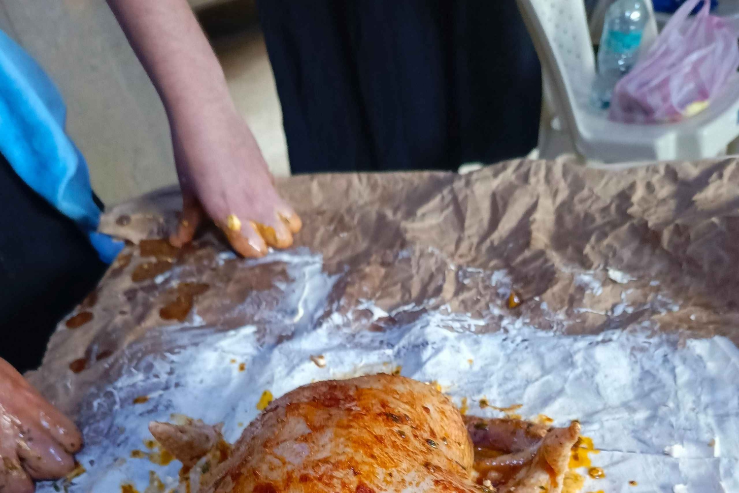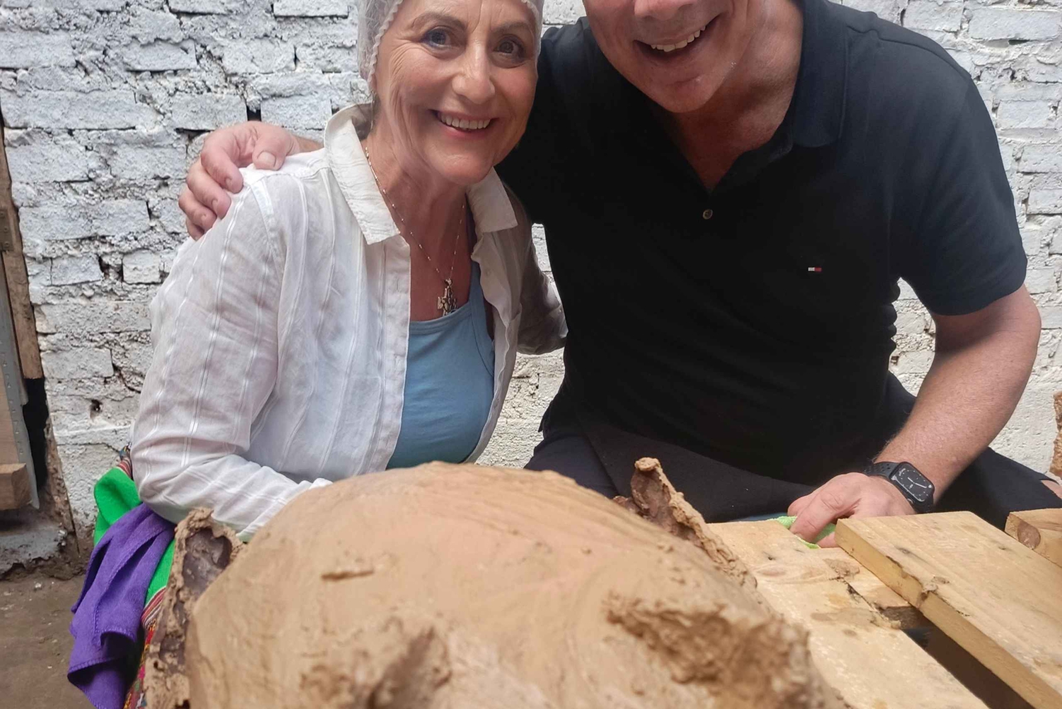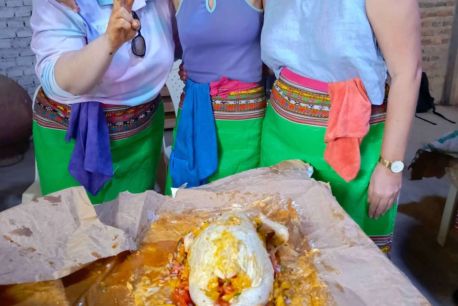 Deretter får dere et forkle, ingredienser, redskaper, kjøkkenutstyr, servise, papir, leire og ovn til den første tilberedningen, som er marinering av kyllingen i leire. Deretter pakkes den inn i papir og dekket med leire, før den settes i leireovnen og stekes i 2 timer. Etter den første fasen kommer smaksprøven av peanøttsuppe etter familiens oppskrift, en typisk rett fra Bolivia, som vi serverer med cocktailer. Vi lærer deg å lage CHUFLAY, en typisk boliviansk brennevin, som vi også bruker til å tilberede en rekke fruktmojitos og en salat med vannmelon og geitost / quinoa og mango.