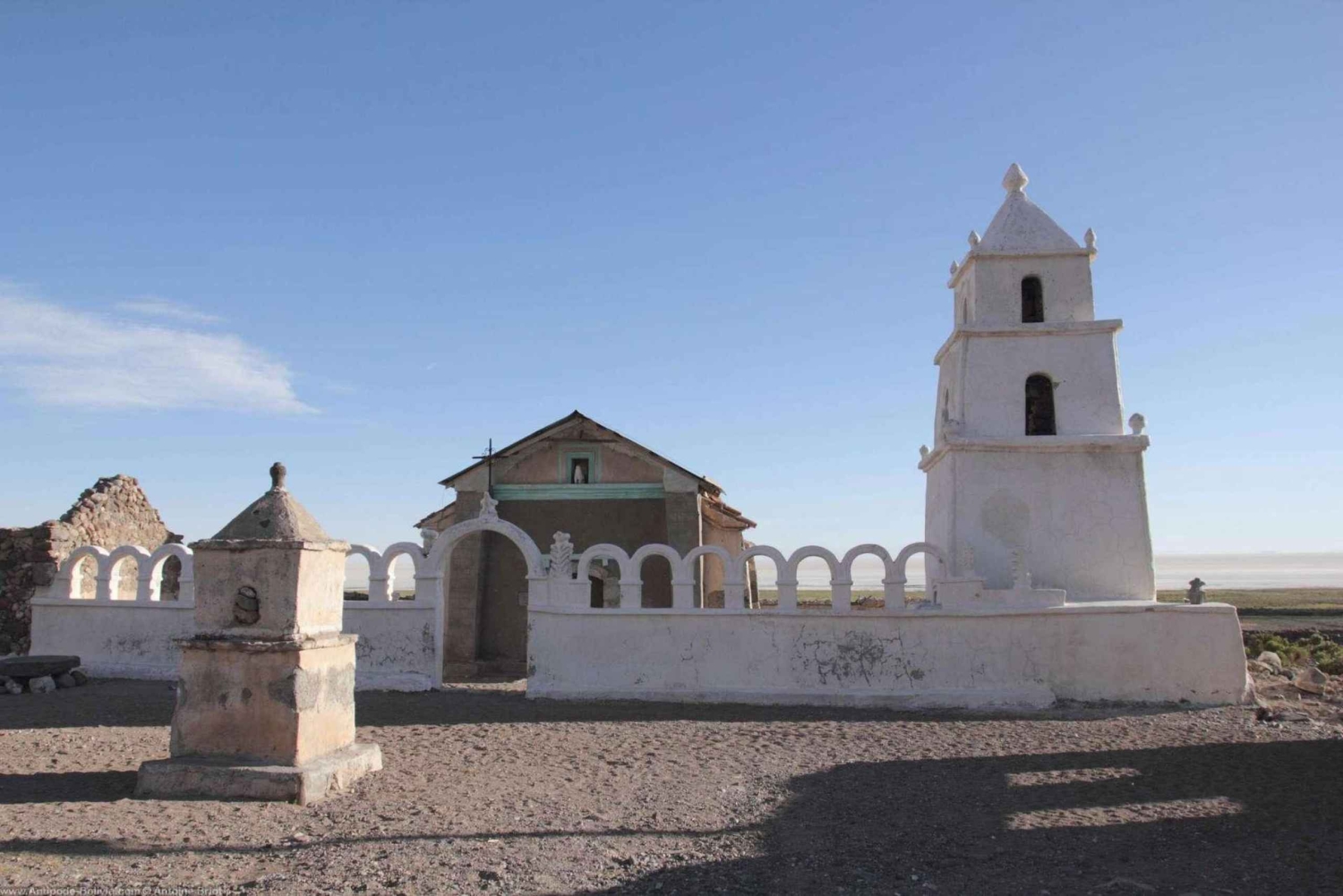 Ucieknij z miasta Uyuni i udaj się na solniska pojazdem 4x4. Odwiedź cmentarz kolejowy, Colchani i Salar de Uyuni. Zobacz hotel Salt, pomnik Dakar i wyspę flag świata. Ciesz się kieliszkiem wina podczas oglądania zachodu słońca.