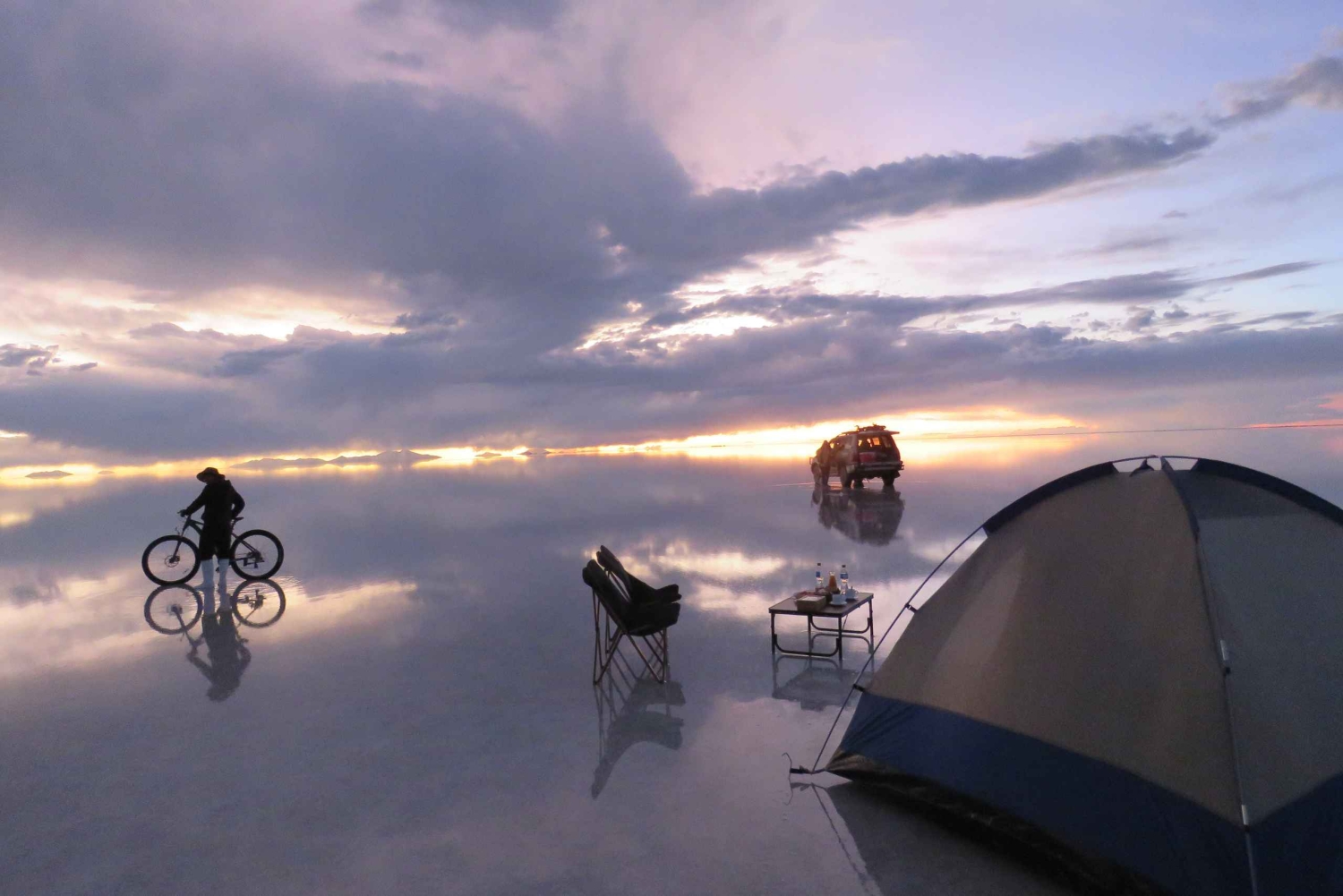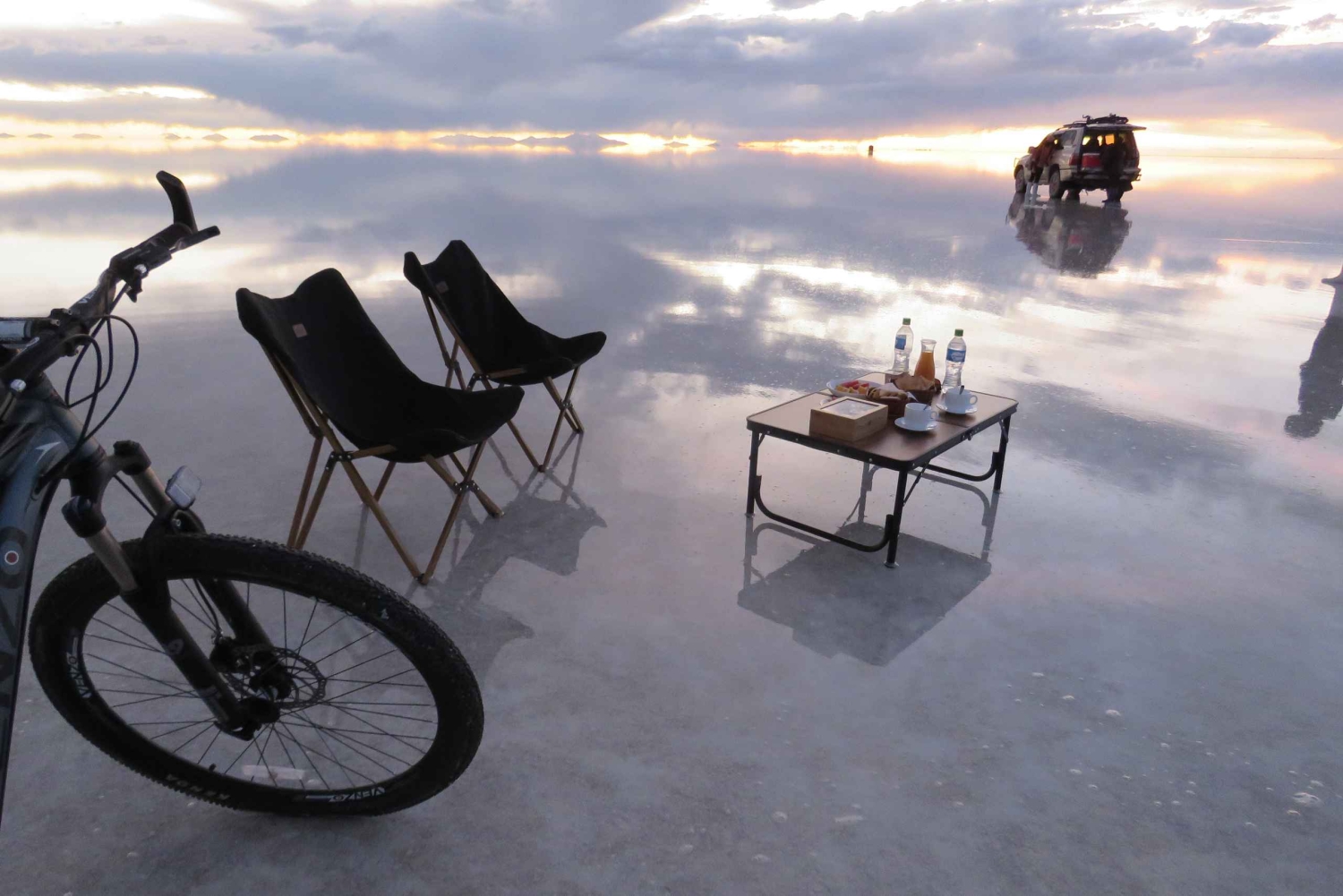 Kiedy dotrzesz do solniska Uyuni, założysz kask i pojedziesz przez solną pustynię, przez duże tony soli, w towarzystwie profesjonalnego przewodnika, samochód będzie podążał za tobą, więc kiedy chcesz odpocząć, możesz położyć rowery w samochodzie i kontynuować wycieczkę.