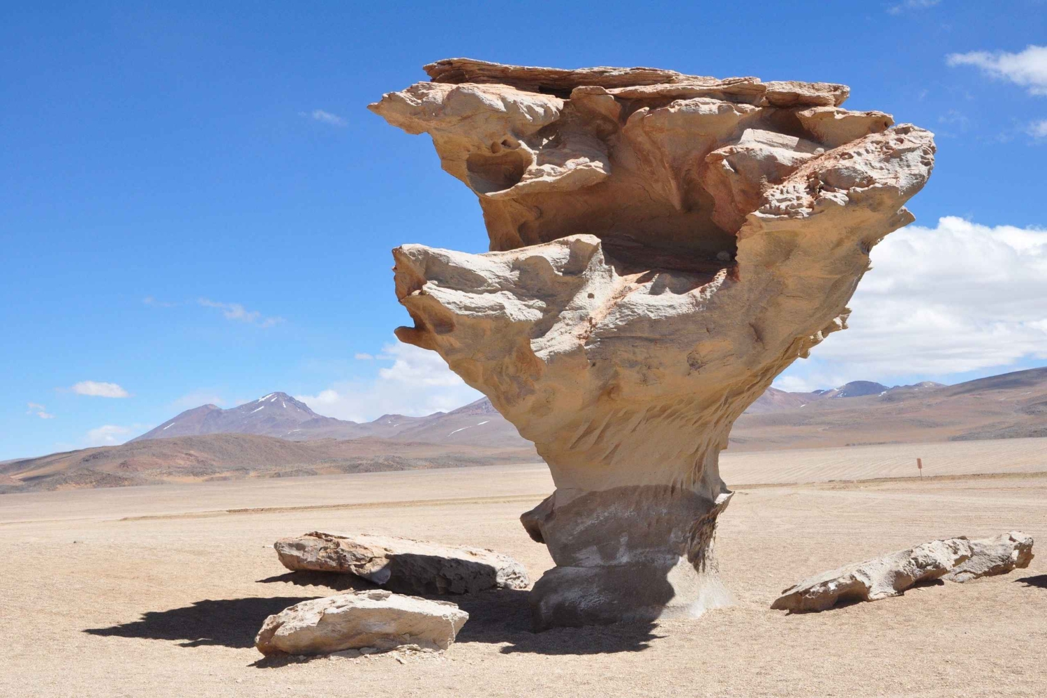 Visitaremos o Valle de Rocas, a Copa do Mundo, Italia Perdida; lugar onde a rocha vulcânica tomou a forma do que parece ser uma cidade abandonada, depois visitaremos o Camel, Sora onde poderás ver animais da região. Lagoa Misteriosa ou Catal onde podes caminhar e ver a flora e fauna típicas do Altiplano Boliviano, Laguna Vinto, Mirador; Cañon de la Anaconda, no final do dia vamos transferir para o Hotel de Sal em Colcha K, onde vamos passar a segunda noite.