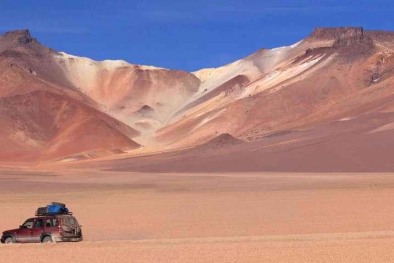 Depois de tomar um café da manhã bem cedo, continuaremos nossa viagem de veículo até a primeira lagoa que encontraremos no caminho: a Lagoa Kollpa. Durante nossa parada nessa planície de sal, aproveitaremos a oportunidade para relaxar nas fontes termais antes de almoçar. Em seguida, continuaremos até a Lagoa Verde, localizada a uma altitude de 4.250 metros, aos pés do vulcão Licancabur, na fronteira entre a Bolívia e o Chile. Depois, continuaremos pela estrada que atravessa o deserto de Dali, onde contemplaremos várias formações rochosas de cores diferentes. Cruzaremos os gêiseres Sol de Mañana antes de finalmente chegarmos ao hotel Tayka Desierto.