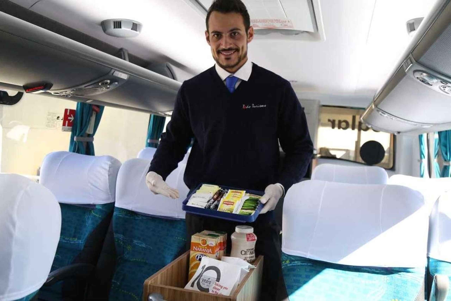 Måltider som serveras ombord på bussen: 2 middagar / 2 frukostar.