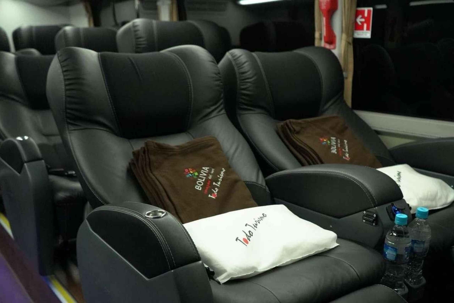 Gå till busskontoret kl. 20.30 för registrering. Sedan går du ombord på bussen från La Paz till Uyuni kl. 21.00. Ombord finns middag, frukost, en flaska vatten, en varm dryck, värme, toaletter, en polar filt, Wi-Fi och ett första hjälpen-kit.