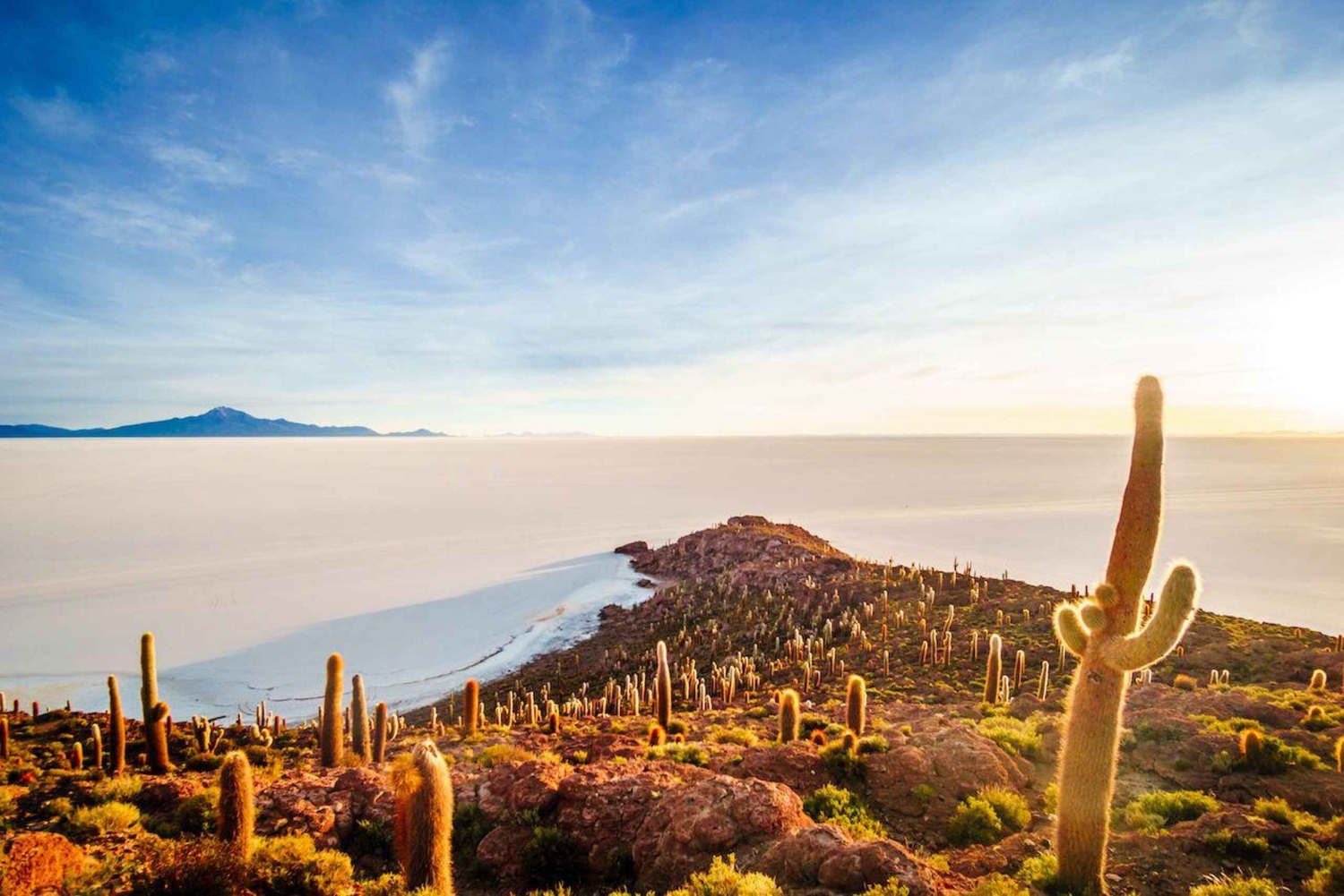 Dag 3: Mycket tidigt på morgonen börjar vi vår sista dag på resan med en soluppgång över Salar de Uyuni. Efter denna upplevelse kommer vi att flytta till Incahuasi Island, en kalkstenformation som ligger i mitten av saltplattan som vi kommer att kunna gå runt och få ett annat perspektiv på saltplattan. Vi fortsätter till Salt Museum och staden Colchani, som redan ligger utanför saltslätten. Härifrån tar vi oss till Uyuni och passerar tågkyrkogården, där vi gör ett kort stopp för att ta bilder. I Uyuni säger vi adjö till vår chaufför och guide, som har följt oss under de senaste tre dagarna, och sedan har vi lite ledig tid för att äta lunch och promenera runt i en del av staden. Efteråt möter vi chauffören som tar oss tillbaka och stannar i Villamar för middag och vila.