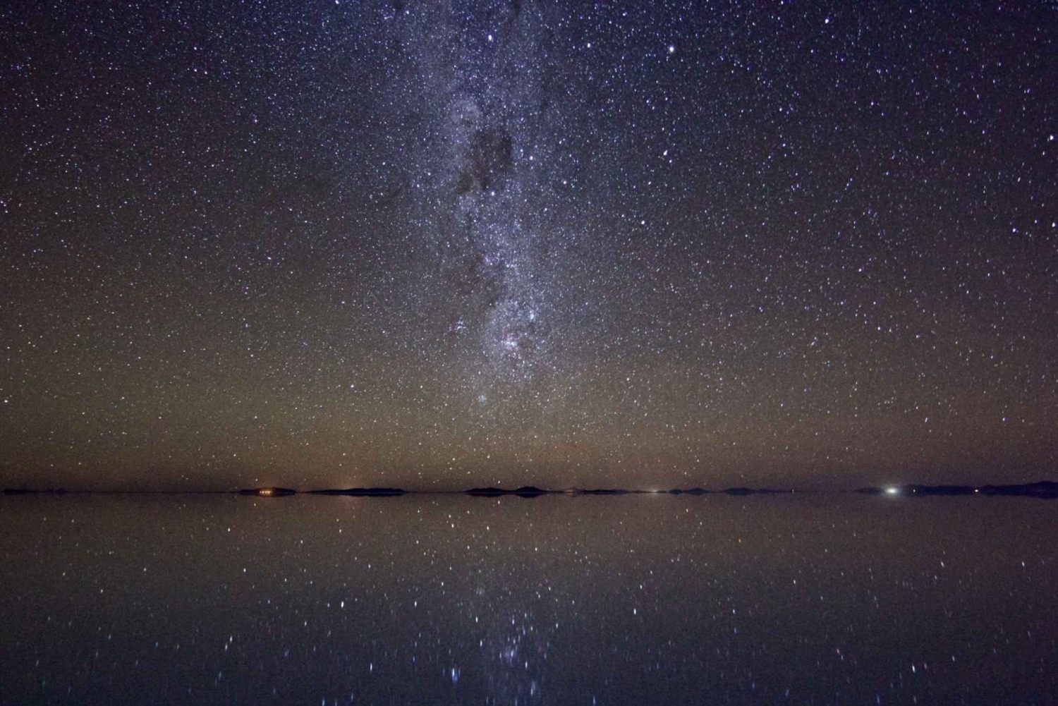 På grund av sin höga höjd, torra klimat och låga befolkningstäthet erbjuder Salar de Uyuni några av de klaraste nattliga vyerna över himlakroppar. Efter att ha njutit av skådespelet återvänder vi till Uyuni omkring kl. 01.30.
